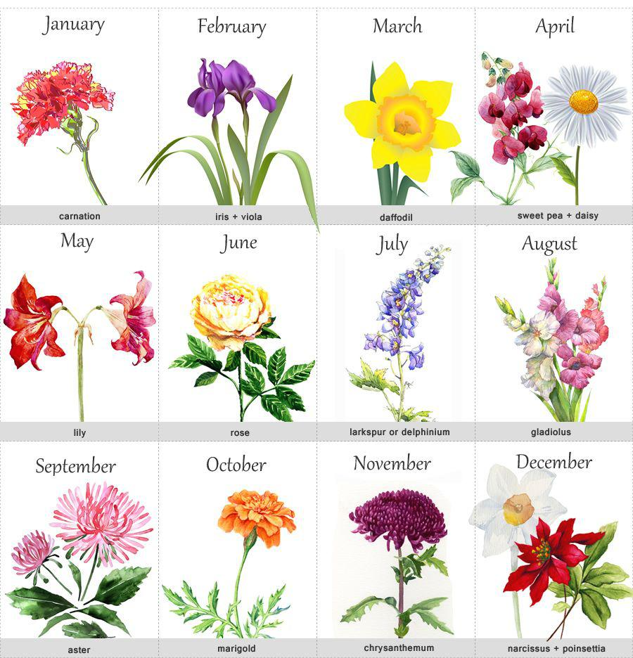생일에 특별함을 더하고 싶다면, 와이프의 탄생화를 선물하는것도 방법이다. 1월은 카네이션, 2월은 아이리스, 3월은 수선화, 4월은 스위트피+데이지, 5월은 백합, 6월은 장미, 7월은 락스퍼(천조초), 8월은 글라디올러스, 9월은 아스터(과꽃), 10월은 메리골드, 11월은 국화, 12월은 수선화다.