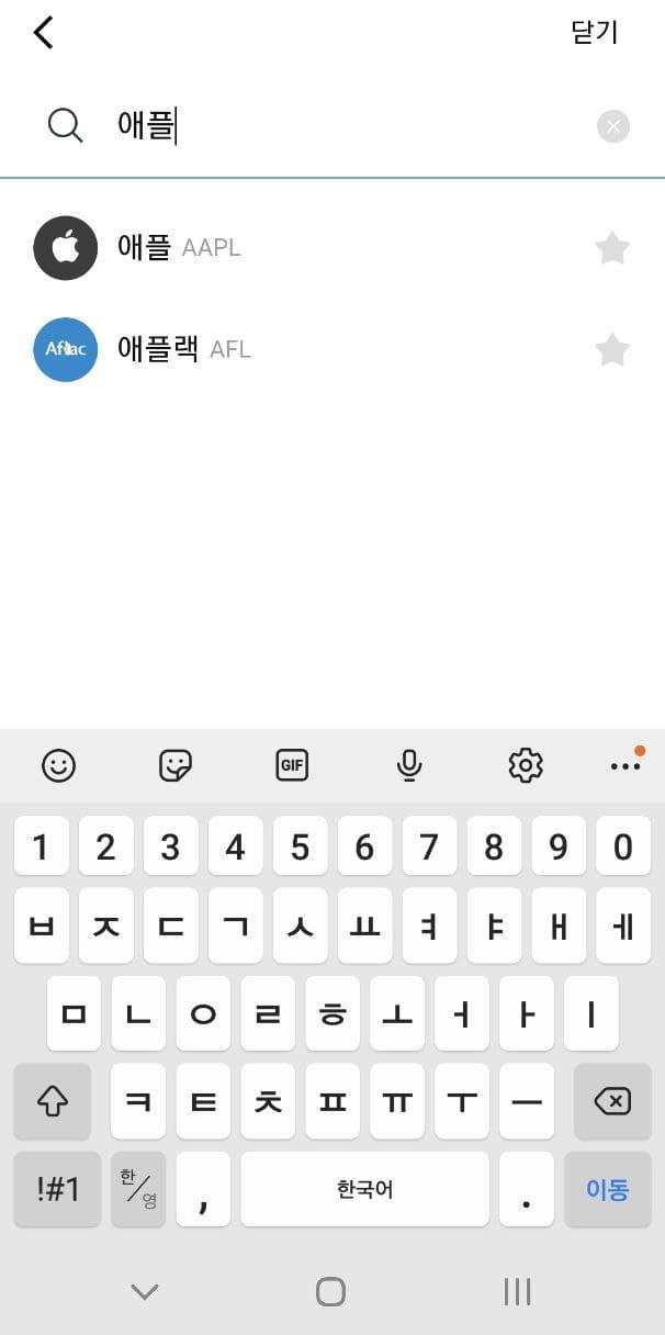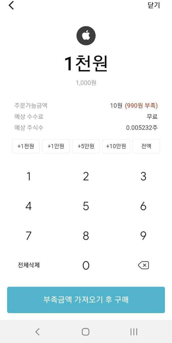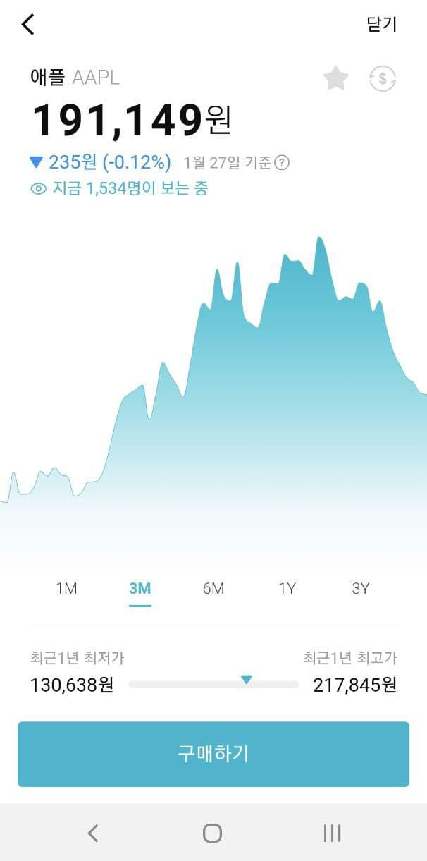 또 검색하기를 누르면 투자할 기업을 찾을 수 있습니다. 맨 왼쪽 사진과 같이 예를들어 애플을 검색하고 누르면, 가운데 화면처럼 현재의 주식시세를 보여줍니다. 맨 아래 구매하기 버튼을 누르고 투자할 금액을 입력하면 끝입니다.